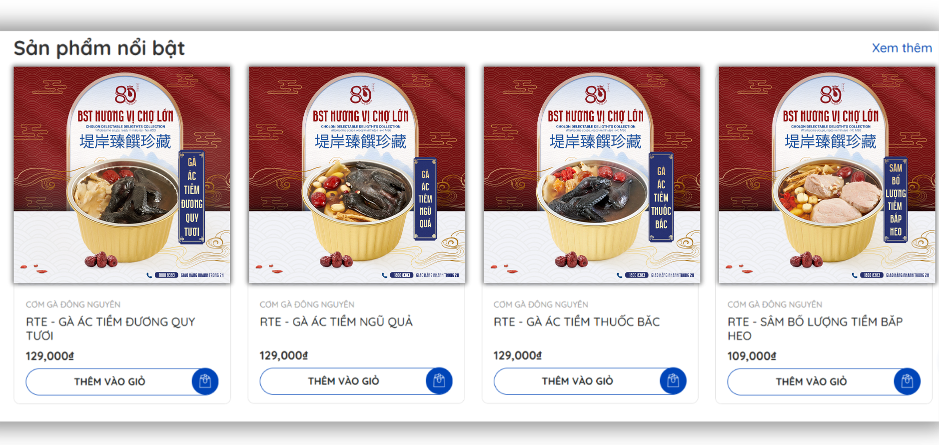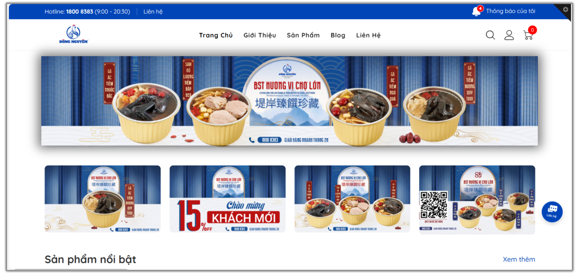 Website tích hợp giỏ hàng thông minh, thanh toán trực tuyến qua VNPAY, Momo và COD. Tính năng đặt món qua QR code cho phép khách offline quét mã tại quán, chuyển sang online liền mạch. Hệ thống quản lý đơn hàng đồng bộ với kho, đảm bảo giao hàng trong 2 giờ nội thành, đặc biệt cho các món nóng như cơm gà Đông Nguyên.