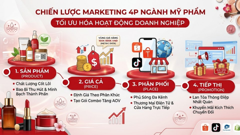 Từ việc tối ưu sản phẩm, định giá hợp lý, mở rộng kênh phân phối đến triển khai truyền thông hiệu quả, doanh nghiệp có thể xây dựng chiến lược marketing cho ngành mỹ phẩm toàn diện nhằm nâng cao nhận diện thương hiệu và gia tăng doanh số bền vững.