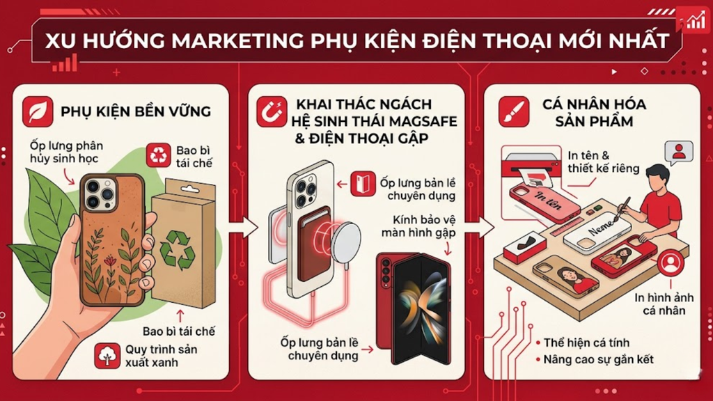 Các xu hướng marketing phụ kiện điện thoại mới phản ánh sự thay đổi trong hành vi tiêu dùng, khi người dùng ưu tiên yếu tố bền vững, công nghệ mới và cá nhân hóa trải nghiệm sản phẩm.